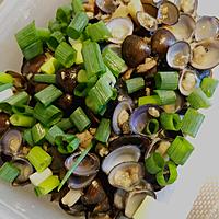 - 2 にんにくの香りが立ったらしじみと白ワインを加え、ふたをして殻が開いたら、しょうゆを入れて味を整えます。