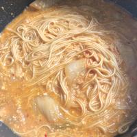 豚肉とエノキを追加して、豆乳少なめの濃厚パスタになりました。