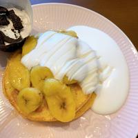 バナナキャラメルは焦がし具合で、ほろ苦さを調節出来ます。出来たてフワフワパンケーキとバナナキャラメルの相性が抜群!生クリームを添えました。