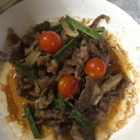 - 3 牛こま切れ肉に火が通ったら、ミニトマト、(A)を加えて中火で炒め、全体に味がなじみ汁気がなくなったら火から下ろします。