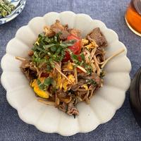 - 3 同じフライパンに牛こま切れ肉、(A)を入れて中火で色が変わるまで炒め、1を入れてさっと炒めます。
