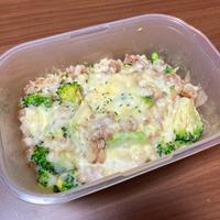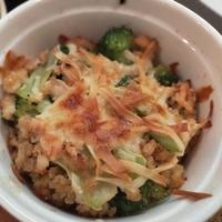 優しい味付けの鶏そぼろを、ブロッコリーと炒め合わせ、ピザ用チーズをかけて、こんがりと焼き上げました。とろりと溶けたチーズがよく合いとてもおいしい一品ですよ。小腹がすいたときや、夜ご飯の一品にいかがでしょうか。