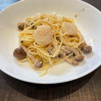 シーフードミックスとキヌサヤがなかったので、生ホタテとシメジを入れました。