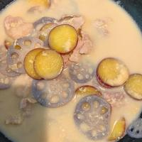 - 4 豚バラ肉に火が通ったら弱火のまま無調整豆乳を入れます。温まったら(A)を入れ、みそが溶けるまで混ぜます。