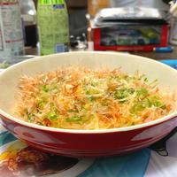 - 5 お皿に盛り付け、小ねぎ、かつお節、明太子をのせて完成です。