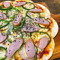 - 2 ピザソース、ミックスチーズ、玉ねぎ、ピーマン、ウインナーを並べます