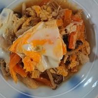 - 6 5にしょうゆを加えてさらに5分ほど煮たら、卵を溶いて回しかけます。