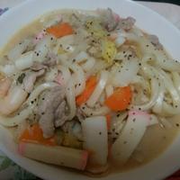 - 6 シーフードミックスを加え中火で火が通るまで炒め合わせ、4、うどんを加えて3分程煮込みます。