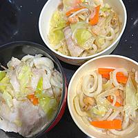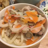 キャベツ、人参、ベビーホタテ、シーフードミックス、豚ロース薄切り。この日は家族それぞれ食べる時間が違ったのでうどんは一緒に煮込まず冷凍うどんをチンしてスープを温め直してかけて食べました。前回作った時はうどんを煮込む時点でスープが少なくなり後から足す羽目になったので今回はうどん4玉に汁は6杯分で作りましたが5人分で良かったかな?一杯分余ったのでおじやにして次の日食べましたがご飯とも合って美味しかった!