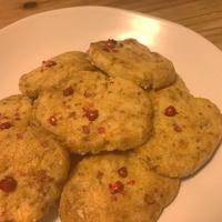 - 4 天板にクッキングシートを敷いて3を並べ、ピンクペッパーを振りかけます。180℃に予熱したオーブンで15分焼いたら完成です。