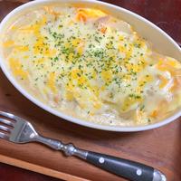 - 7 耐熱皿に3、半分に切った1、6、残りの1、スライスチーズをちぎりながらのせて、オーブントースターで5分焼きます。