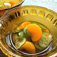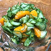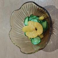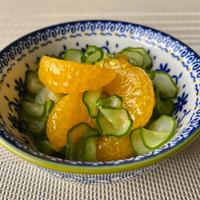 きゅうりとみかんの酢の物です。意外な組み合わせですが、酸っぱい酢の物にみかん缶の甘みが加わりとってもおいしいですよ。酢や砂糖の量を調整して好みの酢の物に仕上げてください。簡単に作れるので、ぜひ一度作ってみてくださいね。