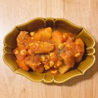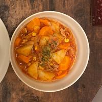 豚こま肉300g、じゃがいも2個、にんじん1本、玉ねぎ1/2個(少し大きめな玉ねぎだったので150g)、コーン100g、水400ml、トマト缶400g、コンソメ顆粒小さじ4、バター10g、パセリで作りました。