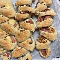 ベーコンが無かったので、ハムと葱とチーズで、マヨネーズ塗って3本、ハムも無くなって、カニカマと葱😅