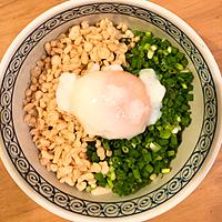 - 4 器に3を盛り、2をかけます。1、あげ玉を盛り付け、温泉卵をのせて完成です。