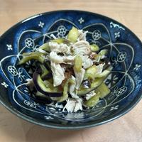 白だしの染みた、ジューシーなナスと、鶏ささみを、さっぱりと梅肉で和えて仕上げました。共にそえた、千切りにした大葉の香りもよく、とてもおいしいですよ。夜ごはんの副菜の一品にいかがでしょうか。ぜひ作ってみてくださいね。