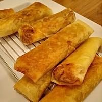 - 4 春巻きの皮を広げ、手前に3とピザ用チーズを1/6量のせて包みます。巻き終わりに水溶き薄力粉をぬり全体を軽く押さえます。同様に5つ作ります。