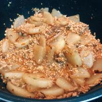 - 4 フライパンにごま油、2、豆板醤を入れて中火で熱します。香りが立つまで炒めたら豚ひき肉を加えて炒め、豚ひき肉がほぐれたら1を加えて大根と豚ひき肉に火が通るまで炒めます。