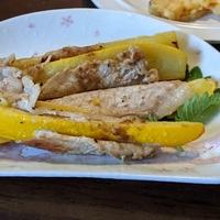- 5 大葉を敷いた皿に盛り付け完成です。