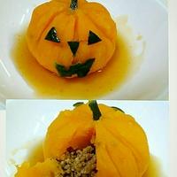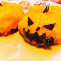 ハロウィンディナーに!かぼちゃの皮で顔までつけてみました🎃可愛くできて満足です☺️💦