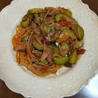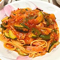 ズッキーニ、新玉ねぎ、トマト缶、ベーコンで作りました。