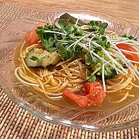トマト缶の代わりにコンソメスープで冷たいスープパスタにしました。