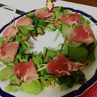 - 4 お皿にのせ、ルッコラ、生ハムを盛り付け、1をリボンの形に飾って完成です。
