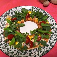 ピザをくり抜くなんて、目からウロコでした、トッピングをいろいろ工夫して楽しいリースができますね。
