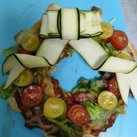 クリスマスにリースの形のピザはいかがでしょうか。いつものピザも、くり抜いてリースの形にすれば簡単に短時間で特別な日にぴったりの一品になりますよ。ズッキーニのリボンを飾ればより華やかになります。お好みの具材で作ってみてくださいね。