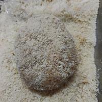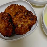 - 10 4等分にし、楕円形に形を整え、薄力粉、溶き卵、パン粉に付け、200℃に熱した揚げ油で、きつね色になるまで揚げます。