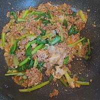 - 2 フライパンを中火に熱し、ごま油をひいて鶏ひき肉を炒め、色が変わってきたら1を加えてさらに炒めます。