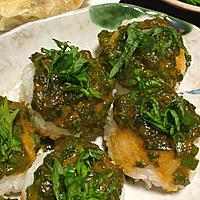 - 5 お皿に盛り付け、大葉をのせて完成です。