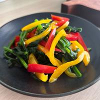 ほうれん草とパプリカのごま和えのご紹介です。緑色のほうれん草と赤、黄色のパプリカをごま和えにしました。味つけもとても簡単で、ごまの風味と甘い味つけがとてもおいしいですよ。
