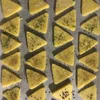 とろけるチーズを混ぜて三角形に切ったあとに、胡椒、ゴマ、パセリ、岩塩をかけてアレンジして焼いてみました
