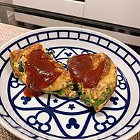 片面の半熟具合がなかなか固まらず、ひっくり返すことができなかったので半分に折りたたみました。ほうれん草も付け足してキッシュ風に。
