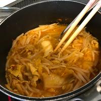 - 4 3に1とキムチを入れて軽く炒めたら、(A)を入れて弱火で5分ほど加熱します。