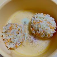 - 2 ボウルに鶏ひき肉、1、片栗粉、しょうゆを入れて混ぜ合わせます。2等分にし小判型にします。