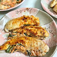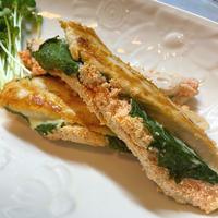 - 2 ささみに、マヨネーズを塗り、シソ、ほぐした辛子明太子の順に挟んで、形を整えます。