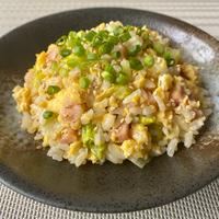 - 4 ごはんを入れて混ぜ、(A)を入れて混ぜ合わせます。卵に火が通るまでラップをかけずに600Wの電子レンジで1分程加熱します。熱いうちに1を加えて混ぜ合わせます。