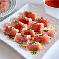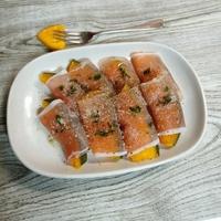 レンジで蒸したかぼちゃを生ハムで巻くだけの手軽さが魅力的なレシピです。かぼちゃの自然な甘みと生ハムの塩気が絶妙なバランスで、仕上げに振りかける粉チーズがコクと風味を加えています。見た目もオシャレで、ピンクペッパーやセルフィーユを添えればパーティーやおもてなしの一品としても映えます。ワインやお酒のおつまみとしても相性抜群で、みんなから好評を得られる一品です。