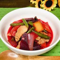 色鮮やかなビーツとゴロゴロ野菜たっぷりのスープのご紹介です。スープは野菜の他に、豚バラ肉、豆が入っていますので、色々な食感が味わえます。お好みのお野菜でもお作りいただけますので、ぜひお試しください。