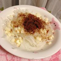 - 5 お皿に、水気を切った1、3、かつお節を乗せて、4をかけ、小ねぎを散らしたら完成です。