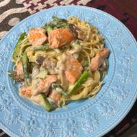 レンジでホワイトソース作り!鮭とアスパラのクリームパスタ レシピ・作り方
