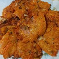 キムチチヂミにはトッピングにエビを加えて、具沢山にしました。焼き加減がとってもふっくらうまくいきました🎵