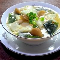 餃子の皮を麺に見立ててスープにしてみました。つるんとしたのどごしの餃子の皮に、しめじやわかめの歯応えがよく合います。今回は素材の旨味を引き立たせるため、味付けは鶏ガラスープの素だけにしましたが、お好みで塩こしょうを入れても美味しいですよ。是非お試しくださいね。