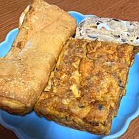 - 4 奥から手前にくるくると巻き、奥にスライドさせ、2を1/3量流し込み、中火で焼きます。