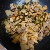 - 3 豚バラ肉に焼き色がつき火が通ってきたら、切り昆布、(A)を入れ、中火のまま味がなじむまで1分ほど炒め、火から下ろします。