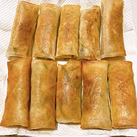 - 5 粗熱を取り、10等分にして、春巻きの皮で巻き、巻き終わりを水溶き薄力粉で留めます。