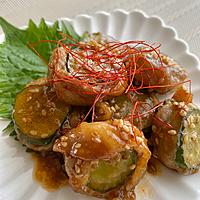 きゅうりを豚肉で巻き、甘辛の韓国ダレで焼きました。きゅうりは生で食べることが多いですが、焼いて食べることでまた違った味わいが楽しめます。濃い目の味付けなので、ごはんのお供や、お酒のおつまみにピッタリな一品です。ぜひお試し下さい。