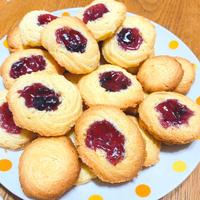 ティータイムのお供に、ハックルベリージャムのロシアケーキはいかがでしょうか。材料を混ぜ合わせて、絞り出すので、成形する手間がなく、とても簡単にお作りいただけます。真ん中に紫色が綺麗なハックルベリージャムが入っているので、とても可愛くおいしいですよ。